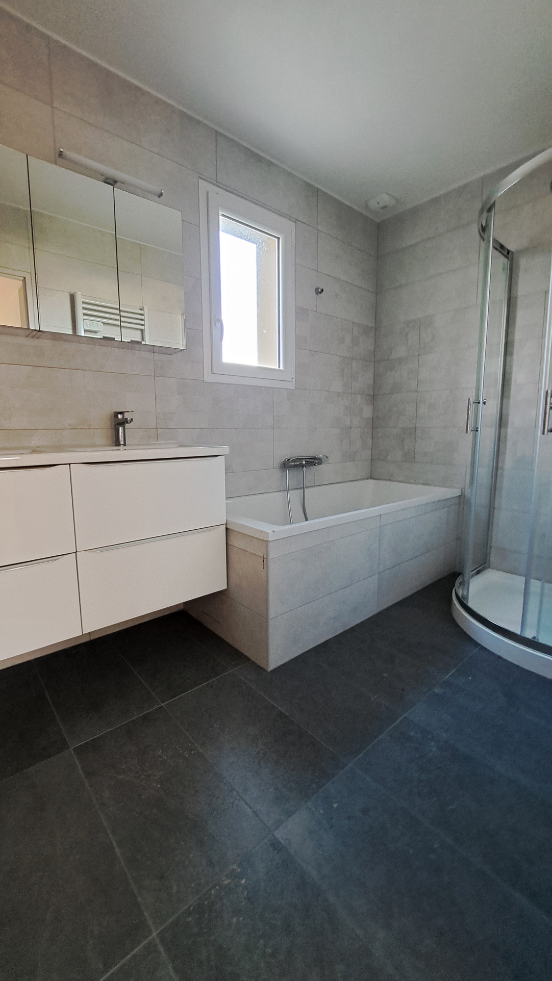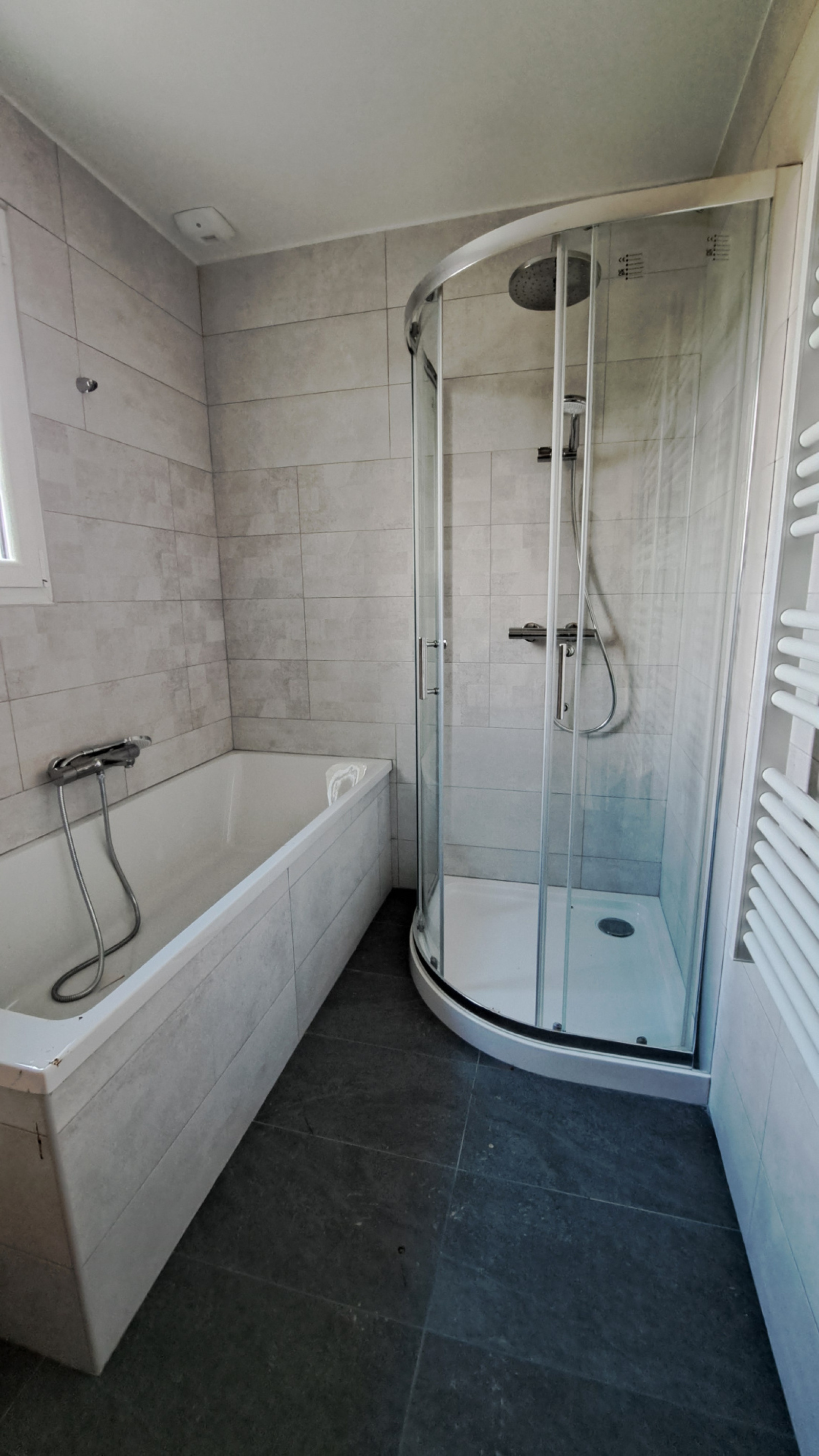 L'étage comprend un palier trois chambres, une salle de bains avec douche et baignoire et un WC Indépendant.