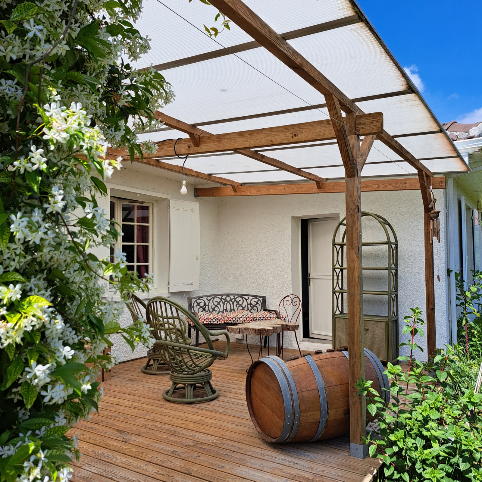 L’espace extérieur dispose d’une grande terrasse couverte à l’est de la maison.