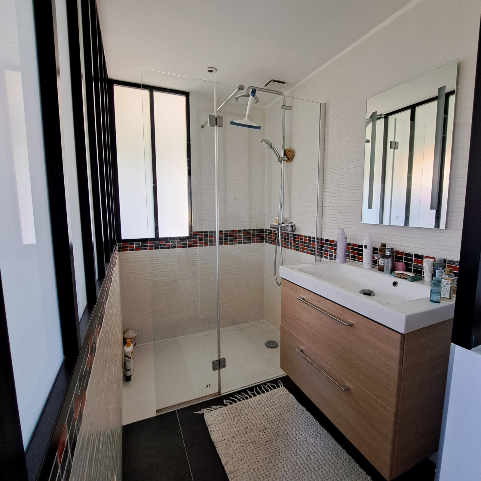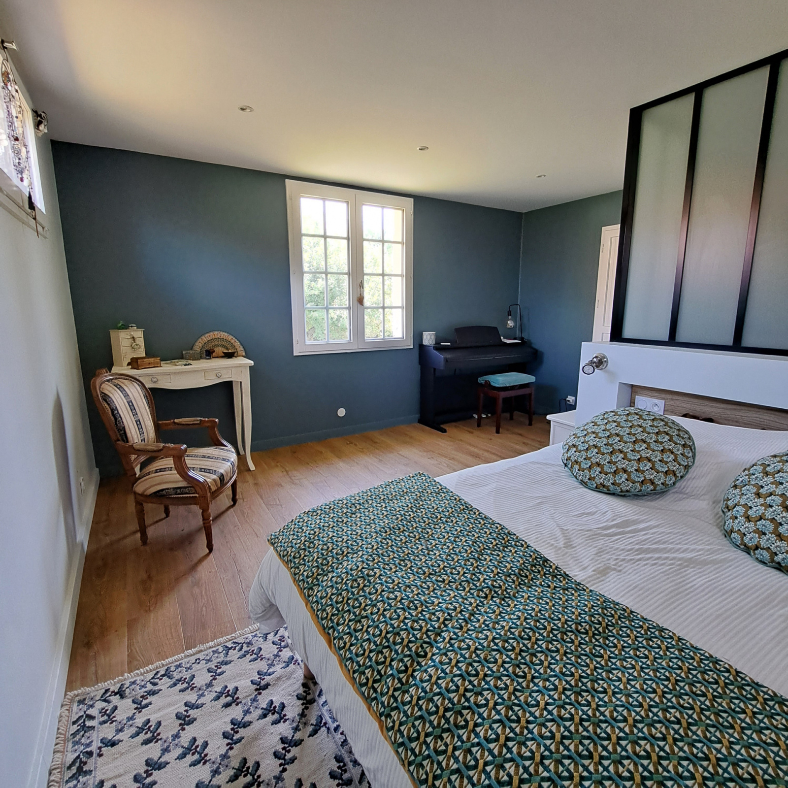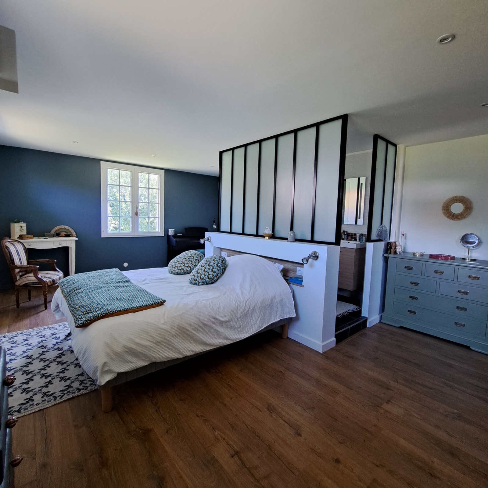 Cette maison de plain-pied se compose d’une entrée, cuisine équipée, salon/séjour avec cheminée, deux grandes chambres, suite parentale de 36 m² avec salle d’eau et dressing, buanderie (ancienne chambre), salle de bains et WC.